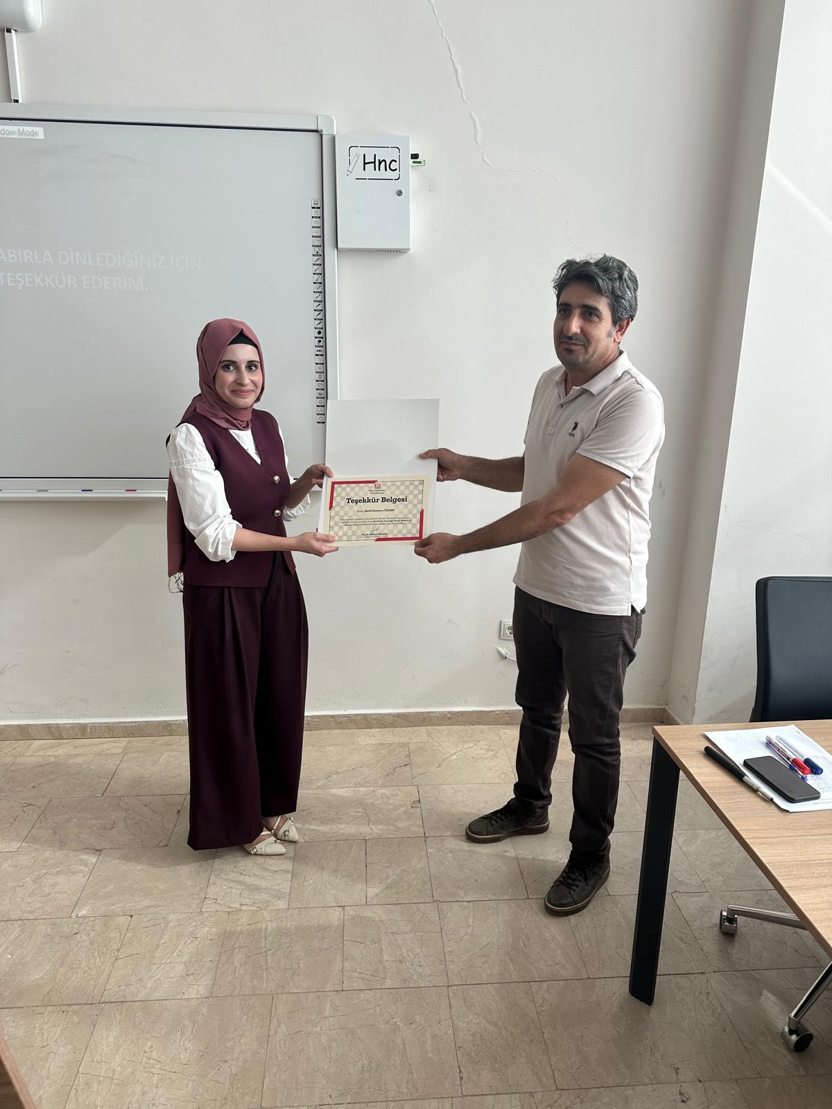 At the end of the program, Accounting and Tax Department Program Head Lecturer. See. Dr. A certificate of appreciation was given to SMMM Betül Sümeyra ÖZMEN by Taha TAŞTAN.